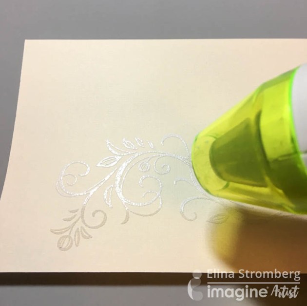 Cover the stamped pattern with Embossing Powder in Silver. Pour off excess back in the powder container.
