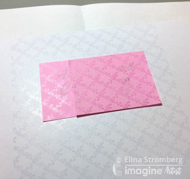 When the ink dries, stamp a heart with the VersaMark ink pad, cover with Mboss White Embossing Powder and heat set.