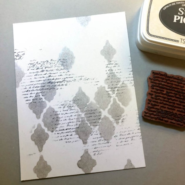 Stamp a script stamp (partial impressions) in Koala Gray StazOn Pigment ink.