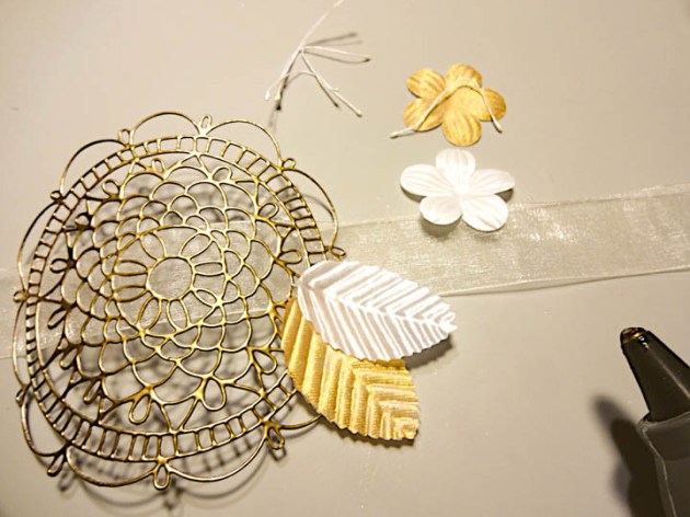 Use the hot glue gun to set the flowers and the leaves onto the doily.