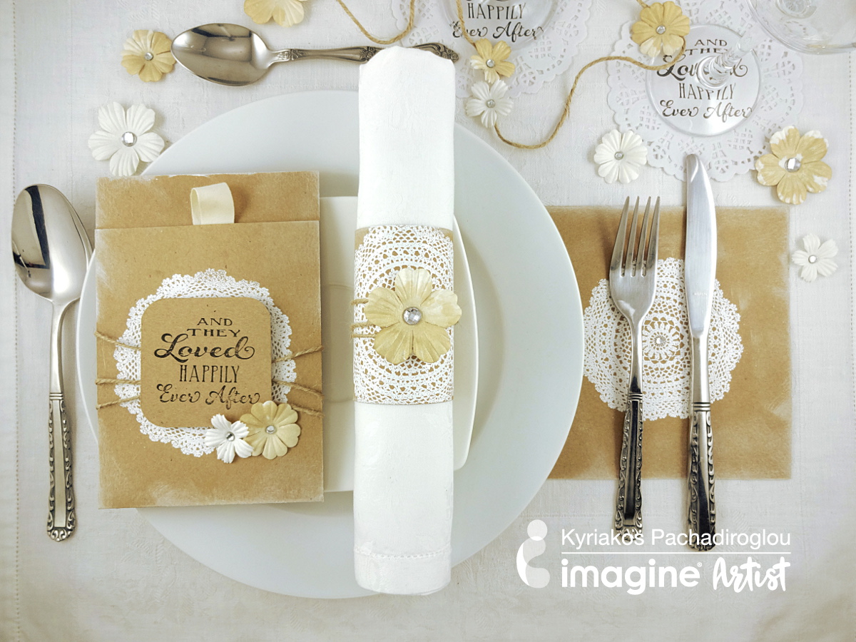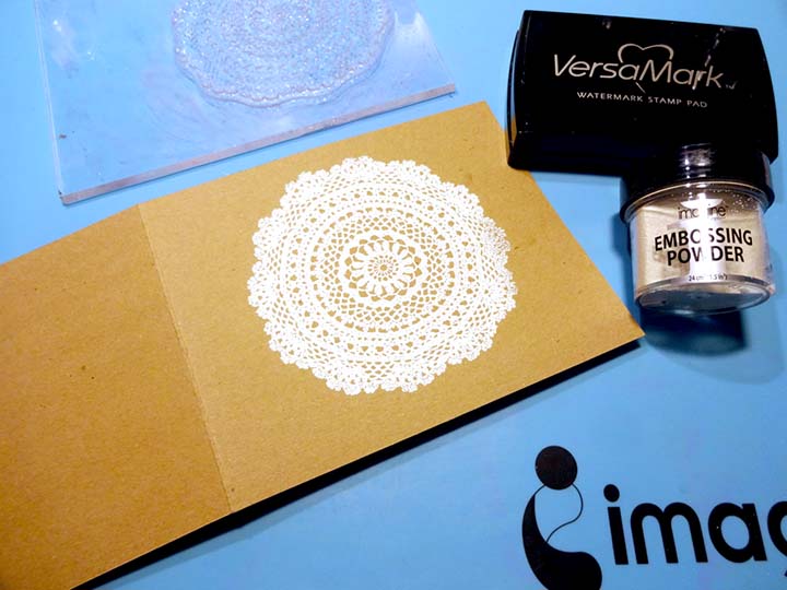 Cut a 6 x 3 inch piece of kraft carstock (for the napkin ring) and a 6 x 8 inch piece (for under the cutlery). Stamp both pieces with the doily image with VersaMark, cover with the white Imagine Embossing Powder and heat set.