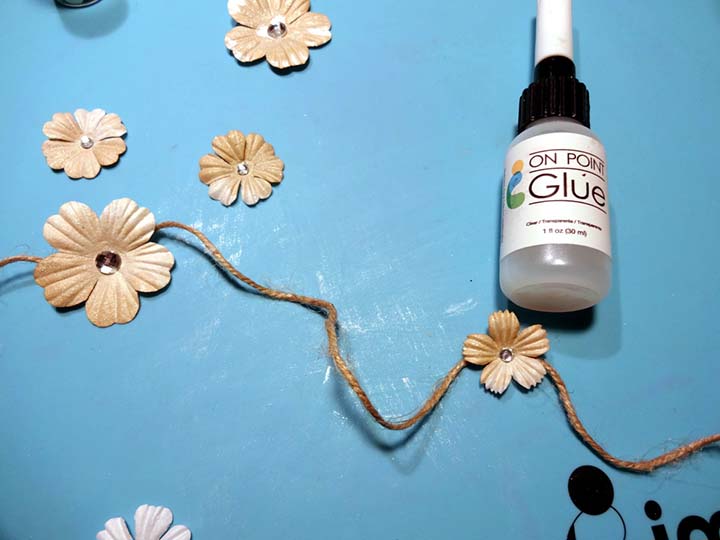 Wrap burlap cord around the napkin ring, add a large a flower and a rhinestone in the center of it using On Point Glue.