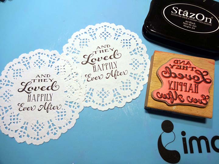 Stamp paper doilies with sentiment stamp and the StazOn Jet Black inkpad. The StazOn ink will stay put on the doilies when they are used as coasters and won’t bleed if they get wet. It also dries very quickly, so the stamping for these pieces can go very quickly.