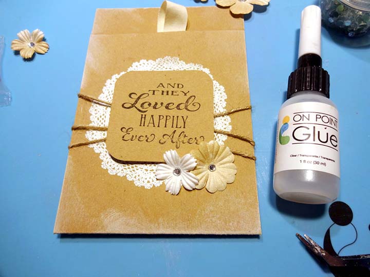 Add paper flowers and rhinestones gluing with the On Point Glue. Fill this simple envelope with a small favor or the menu.